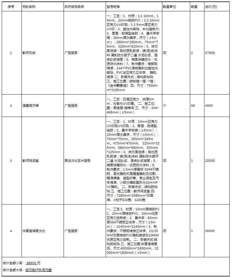 第1次分期支付金额为84455元,所占总合同金额百分之95,说明:第一次在货物入场或安装完成具备使用条件后30个工作日内支付合同总金额的95%; 第2次分期支付金额为4445元,所占总合同金额百分之5,说明:从出具政府采购合同验收报告单之日起正常使用一年后(无质量问题、售后服务及其他经济法律纠纷等)支付合同总金额的5%,该期为履约验收期;,该期为履约验收期 5.1 验收程序 采用 一般程序验收 5.2 质量要求 (1)中标人提供的产品应是原厂生产的未经使用正品。符合国家质量检测标准,具有出厂合格证或国家鉴定合格证。 (2)整体项目质保期要求叁年,按国家三包政策执行,超出厂家正常保修范围的,中标人需向厂家购买,未在投标报价表中单列其费用的,视为免费提供。(3)质保期从验收合格后开始计算。质保期内所有设备维护等要求免费上门服务。 5.3 验收要求和验收标准1.1项目验收国家有强制性规定的,按国家规定执行,验收费用由中标人承担,验收报告作为申请付款的凭证之一。1.2验收的标准和依据:包括本采购项目的招标文件、中标人的投标文件、政府采购合同和有关国家标准与行业规范,2.3按照《关于进一步规范政府采购项目履约验收工作管理的通知》(长财采购[2016]6号) 的规定,本项目采用一般程序验收:在验收实施过程中,允许对产品进行使用性测试,及破损性实验,测试过程中因产品质量问题造成的损失由中标人承担,并返工直至合格,有关返工、再行验收,以及给采购人造成的损失等费用由中标人承担。4.4如验收不合格,中标人须更换合格货物、辅材或重新进行安装与调试,直至验收合格。如两次验收不合格,采购人有权终止与中标人签订的政府采购合同,另行选择供应商承担本采购项目的供货和相关服务。中标人须承担因验收不合格而返工造成的自身的一切损失和因此给采购人造成的一切损失。5.5如验收过程中发生纠纷,将委托国家质最技术监督管理部门或其认定的机构进行检测袭定。如为中标人原因,一切费用由中标人承担。否则,由采购人承担。 6.甲乙双方的权利与义务权利瑕疵担保1、乙方保证对齐出售的货物享有合法的权利。2、乙方保证在其出售的货物上不存在任何未曾向甲方透露的担保物权,如抵押权、质押权、留置权等。3、如甲方使用该货物构成上述侵权的,则由乙方承担全部责任,知识产权保护1、乙方对齐所销售的货物应当享有知识产权或经权利人合法授权,保证没有侵犯任何第三人的知识产权和商业秘密等权利。2、甲方使用乙方提供的货物对第三人构成侵权的,应当由乙方承担全部法律责任,给甲方造成损赛的,乙方应当承担赔偿责任。3、甲方委托乙方开发的产品,甲方享有知识产权,未经甲方许可不得转让任何第三人。保需义务1、甲、乙双方在采购和履行合同过程中所获悉的对方属于保密的内容,双方均有保密义务。 7.违约责任7.1 对中小微企业未及时支付的违约责任约定:采购人不得以法定代表人或者主要负责人变更,履行内部付款流程,或者在合同未作约定的情况下以等待竣工验收批复、决算审计等为由,拒绝或者迟延支付中小微企业款项。 7.2 如中标(成交)供应商系中小微企业,采购人存在迟延支付乙方合同款项的,应当承担付款逾期利息。双方对逾期利息的利率约定为年息1%(约定利率不得低于合同订立时1年期贷款市场报价利率),未做约定的,按照每日利率万分之五的标准支付逾期利息。 7.3 甲方不得以行政区划调整、政府换届、机构或者职能调整以及相关责任人更替等为由违约毁约。因国家利益、社会公共利益需要改变政策承诺、合同约定的,应当依照法定权限和程序进行,并依法对乙方因此受到的损失予以补偿。 1.1货物安装调试要求(1)中标人须加强施工的组织管,所有施工人员须遵守文明安全施工的有关规章制度,持证上岗。 (2)中标人负责产品到施工地点的全部运输,包括装卸及现场搬运等。(3) 中标人负责其派出的施工人员的人身意外保险。 (4) 中标人负责产品免费送货上门,免费安装、调试,由此所产生的一切材料费、工具费、人工费、手续费、差旅费、食宿费和加班费等,均由中标人承担。安装调试期间所发现一切安全和质量事故及费用,均由中标人承担。 (5)安装调试所需辅助材料和专用工具与设施,由中标人提供。(6)安装调试完毕,中标人自行检测合格后,方可申请采购人进行验收。 (7)项目完成后,中标人应将项目有关的全部资料,包括产品资料、技术文档施工图纸等,移交使用单位。1.2技术支持要求(1)投标人承诺并实施任何时期的24小时技术咨询服务,及时答复使用方的技术咨询。(2)中标人须按采购人要求,在申请采购人进行验收前,培训采购人指定人员,达到能正确使用和维护、简单维修货物的水平。 8.解决争议的方法 首先通过双方协商解决,协商解决不成,则通过以下途径之一解决纠纷: 向甲方所在地人民法院提起诉讼。 9.组成合同的文件 合同由以下文件构成,如下述文件之间有任何抵触、矛盾或歧义,应按以下顺序解释: (1)在采购或合同履行过程中乙方作出的承诺以及双方协商达成的变更或补充协议 (2)中标或成交通知书 (3) 响应文件 (4)政府采购合同格式条款及其附件 (5)专用合同条款(如果有) (6)通用合同条款(如果有) (7)标准、规范及有关技术文件,图纸,已标价工程量清单或预算书(如果有) (8)其他
