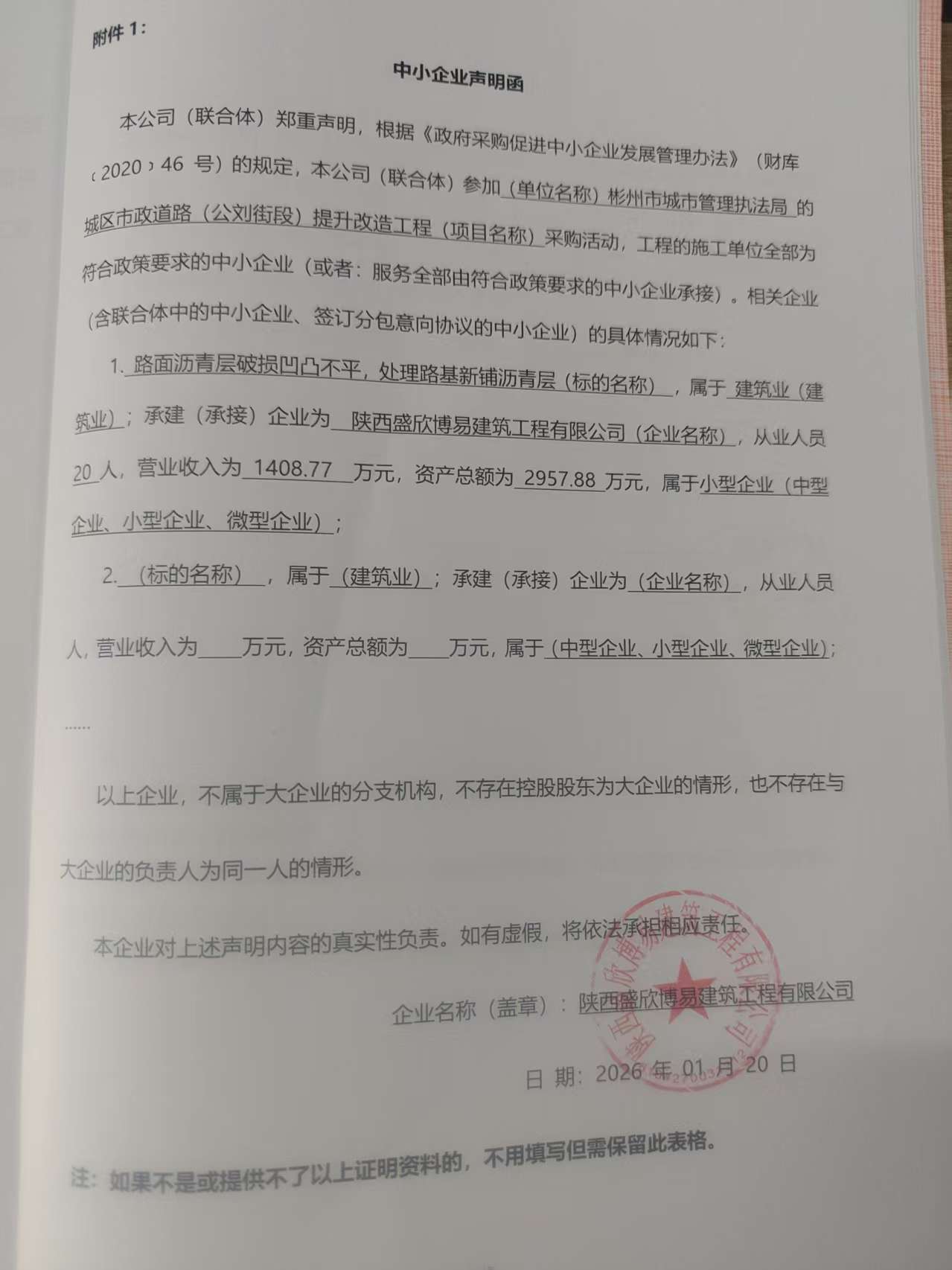 | 附件下载:彬州市城市管理执法局城区市政道路(公刘街段)提升改造工程中标(成交)明细.pdf 附件下载:招标文件.pdf 附件下载:中小企业声明函.jpg |