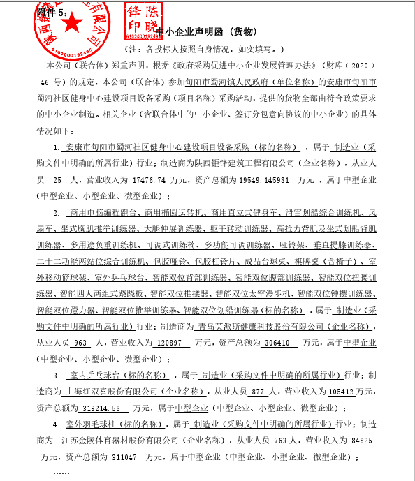 | 1 | 健身设备 | 安康市旬阳市蜀河社区健身中心建设项目设备采购 | 英派斯、红双喜、金陵 | / | 1.00(项) | 652,425.00 | 652,425.00 |